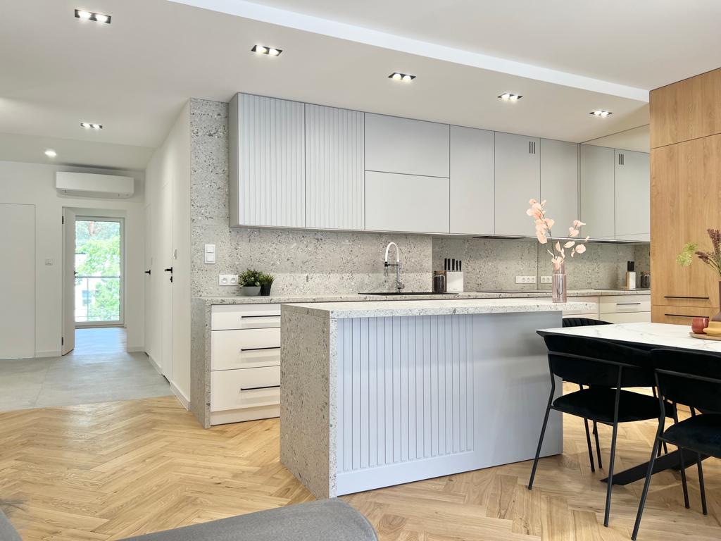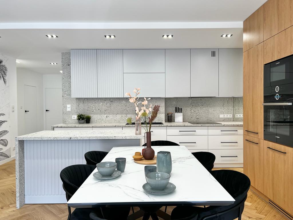 90% naszych realizacji to mieszkania w których wykonaliśmy remont plus meble do zabudowy stałej. 50% mieszkań, które realizujemy, są również z meblami wolnostojącymi. 100% procent naszych mieszkań to mieszkania, w których wykonaliśmy – pełną łazienkę, wszystkie podłogi, drzwi między pomieszczeniami, malowanie, montaż oświetlenia.